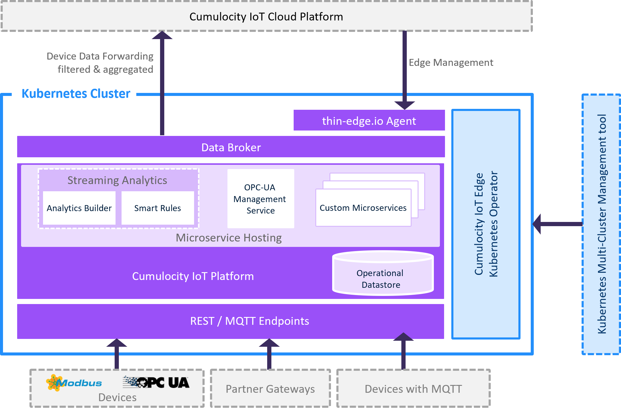 Edge is a cloud-native solution for the delivery, deployment, and management of the single-server variant of the Cumulocity platform. In contrast to the Cumulocity platform, which is available in the cloud (for example, using AWS, Azure, or other data centers), Edge is installed in factories, that is, in the same site (“onsite”) in which the IoT assets are located.
